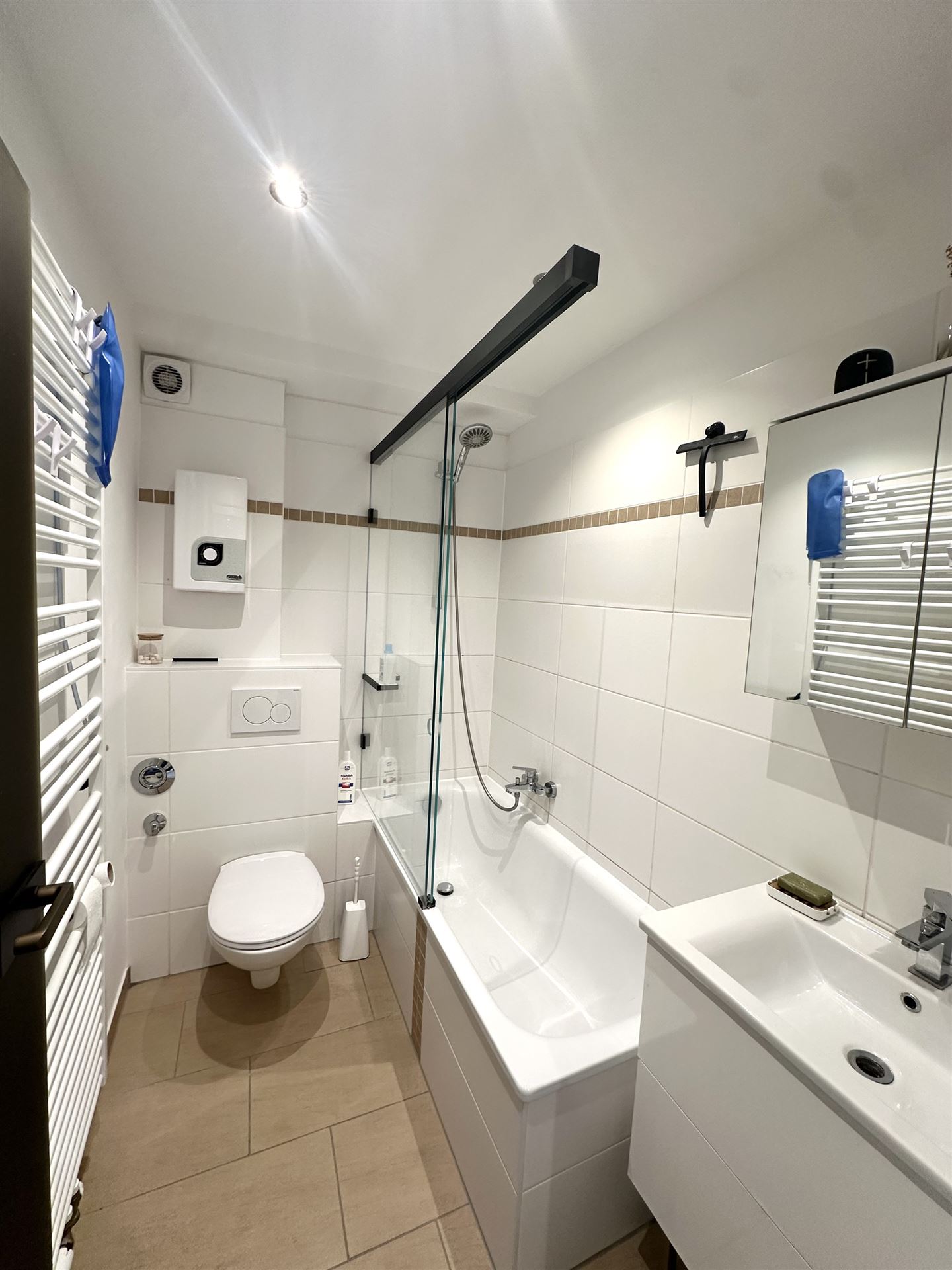 • Helles Badezimmer mit Badewanne und Duschabtrennung