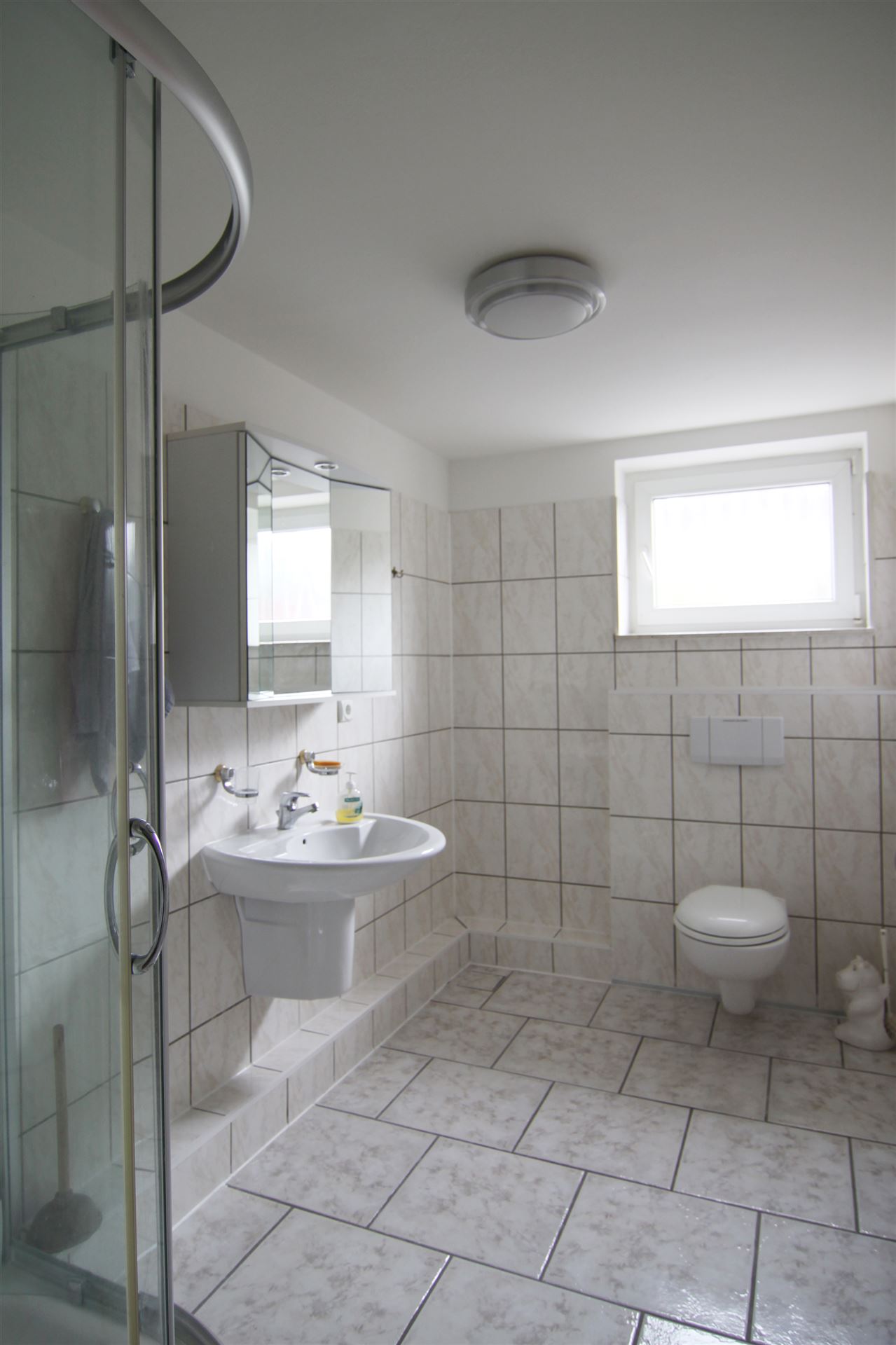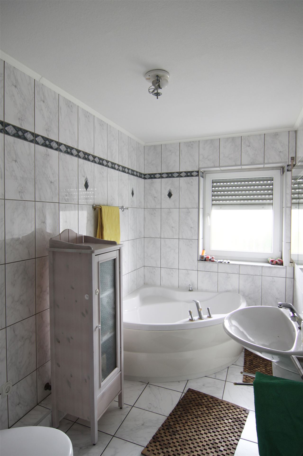 - Der untere Bereich ist mit hellen, marmorierten Fliesen versehen